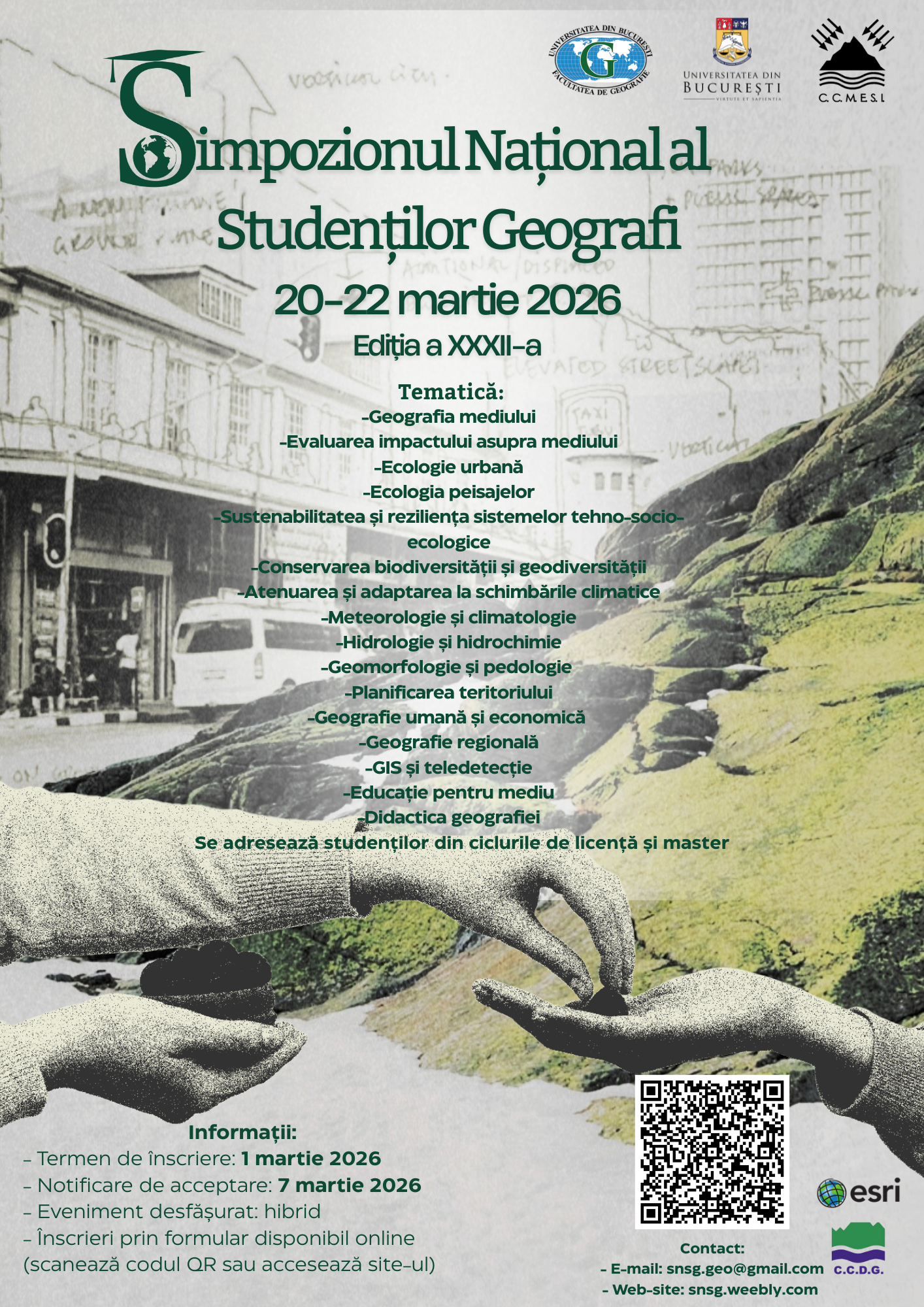 Avem plăcerea de a invita studentii facultatii dumneavoastra la cea de-a XXXIIa editie a Simpozionului National al Studentilor Geografi ce va avea loc in perioada 20-22 martie 2026 in Bucuresti.